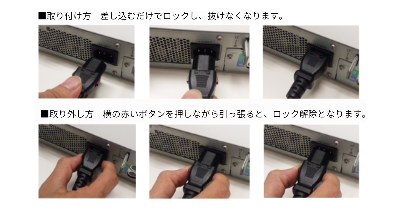 抜け止めロック付きC13電源ケーブル。 累計販売数25万本突破! サーバ、ネットワークネットワーク機器など重要機器の抜け止め防止に最適です。